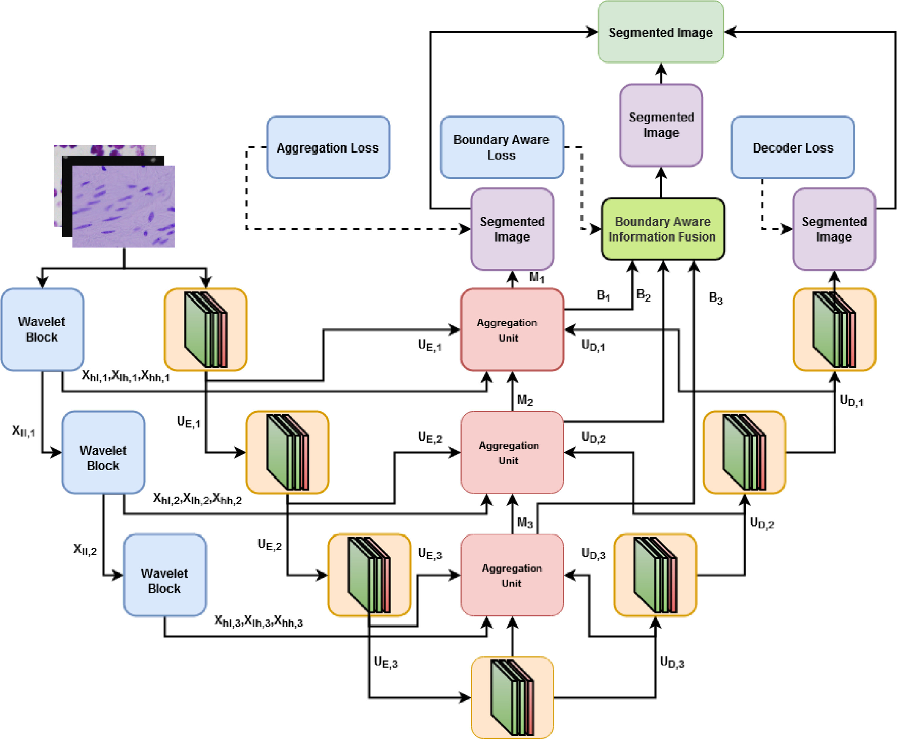 Precise cell nucleus segmentation is very critical in many biologically related analyses and disease diagnoses. However, the variability in nuclei structure, color, and modalities of histopathology images make the automatic computer-aided nuclei segmentation task very difficult. Traditional encoder–decoder based deep learning schemes mainly utilize the spatial domain information that may limit the performance of recognizing small nuclei regions in subsequent downsampling operations. In this paper, a boundary aware wavelet guided network (BAWGNet) is proposed by incorporating a boundary aware unit along with an attention mechanism based on a wavelet domain guidance in each stage of the encoder–decoder output. Here the high-frequency 2 Dimensional discrete wavelet transform (2D-DWT) coefficients are utilized in the attention mechanism to guide the spatial information obtained from the encoder–decoder output stages to leverage the nuclei segmentation task. On the other hand, the boundary aware unit (BAU) captures the nuclei’s boundary information, ensuring accurate prediction of the nuclei pixels in the edge region. Furthermore, the preprocessing steps used in our methodology confirm the data’s uniformity by converting it to similar color statistics. Extensive experimentations conducted on three benchmark histopathology datasets (DSB, MoNuSeg and TNBC) exhibit the outstanding segmentation performance of the proposed method (with dice scores 90.82%, 85.74%, and 78.57%, respectively).
