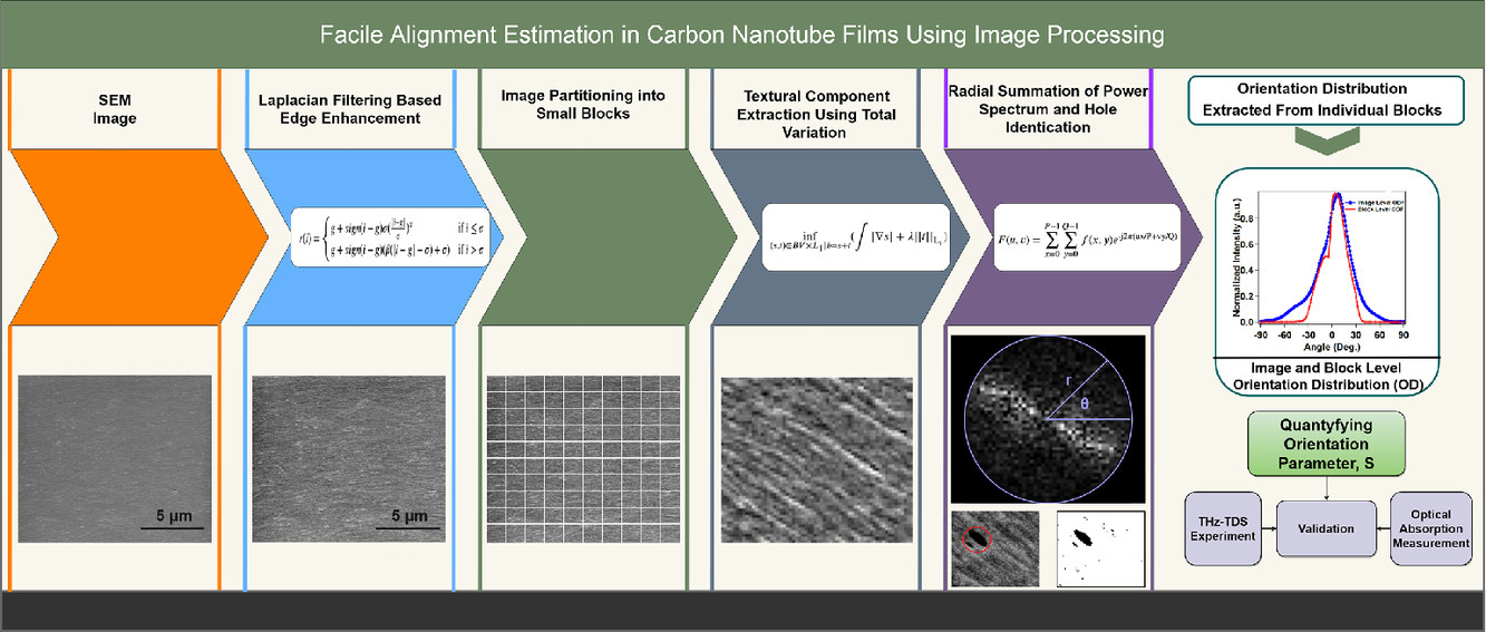 Whether a macroscopic assembly of carbon nanotubes can exhibit the one-dimensional properties expected from individual nanotubes critically depends on how well the nanotubes are aligned inside the assembly. Therefore, a simple and accurate method for assessing the degree of alignment is desired for the rapid characterization of carbon nanotube films and fibers. Here, we present an end-to-end solution for determining the global and local spatial orientation of carbon nanotubes in films within a short amount of time using a fast, precise, and economical approach based on an image processing method applied to scanning electron microscopy images. We first use Laplacian edge enhancement filtering for improving the appearance of edge regions, which is followed by image partitioning into multiple blocks to capture the nanoscale orientation characteristics and total variation-based image decomposition of these image blocks. We then perform a 2D-fast Fourier transform on the image decomposed textural components of these edge-enhanced image blocks to determine the orientation distribution, which is utilized to estimate the 2D nematic order parameter. To show the effectiveness of our method, we corroborated our results against results obtained with other state-of-the-art image processing and experimental techniques.
