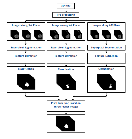 Automated Brain Tumor Segmentation Based on Multi-Planar Superpixel Level Features Extracted From 3D MR Images